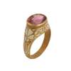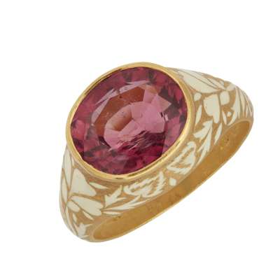 collet set with an oval mixed-cut tourmaline, the mount with cream mina-work enamelling in the Indian style, British hallmarks and stamped '750'