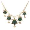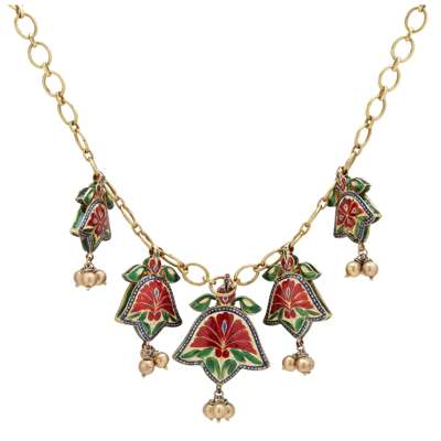 set with five graduated carved and foiled emeralds in the form of a lotus flower, and with table and rose cut diamonds, the reverse with flowers and foliage in blue, cream, and translucent green and red enamel, on a plain link chain with hook clasp