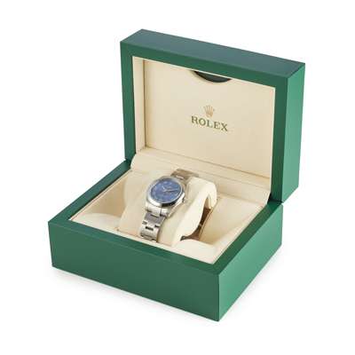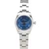 Oyster perpetual, Azzuro blue dial, sweep second hand, blue Roman numerals and silvered at the quarters, stainless steel Oyster bracelet, screw down crown, with papers and box