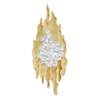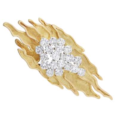 the centre claw set at various heights with a cluster of twenty round brilliant cut diamonds, surrounded by flame-shaped yellow gold panels each with matted centre and polished border, reverse with double pin clasp and suspension loop, with British hallmarks for London, 1973, and signed ‘GRIMA’, contained in a box for Grima