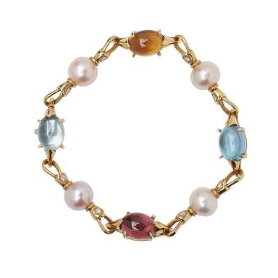 claw set with oval cabochons of topaz, tourmaline and citrine, with pearls between, pavé set with round brilliant cut diamond to either side of the pearl, to a concealed clasp, signed 'BVLGARI' stamped '750 MADE IN ITALY' and with Italian maker's mark