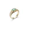 Collet-set with an oval-cut emerald, within a brilliant-cut diamond-set frame, between similarly-cut diamond-set shoulders