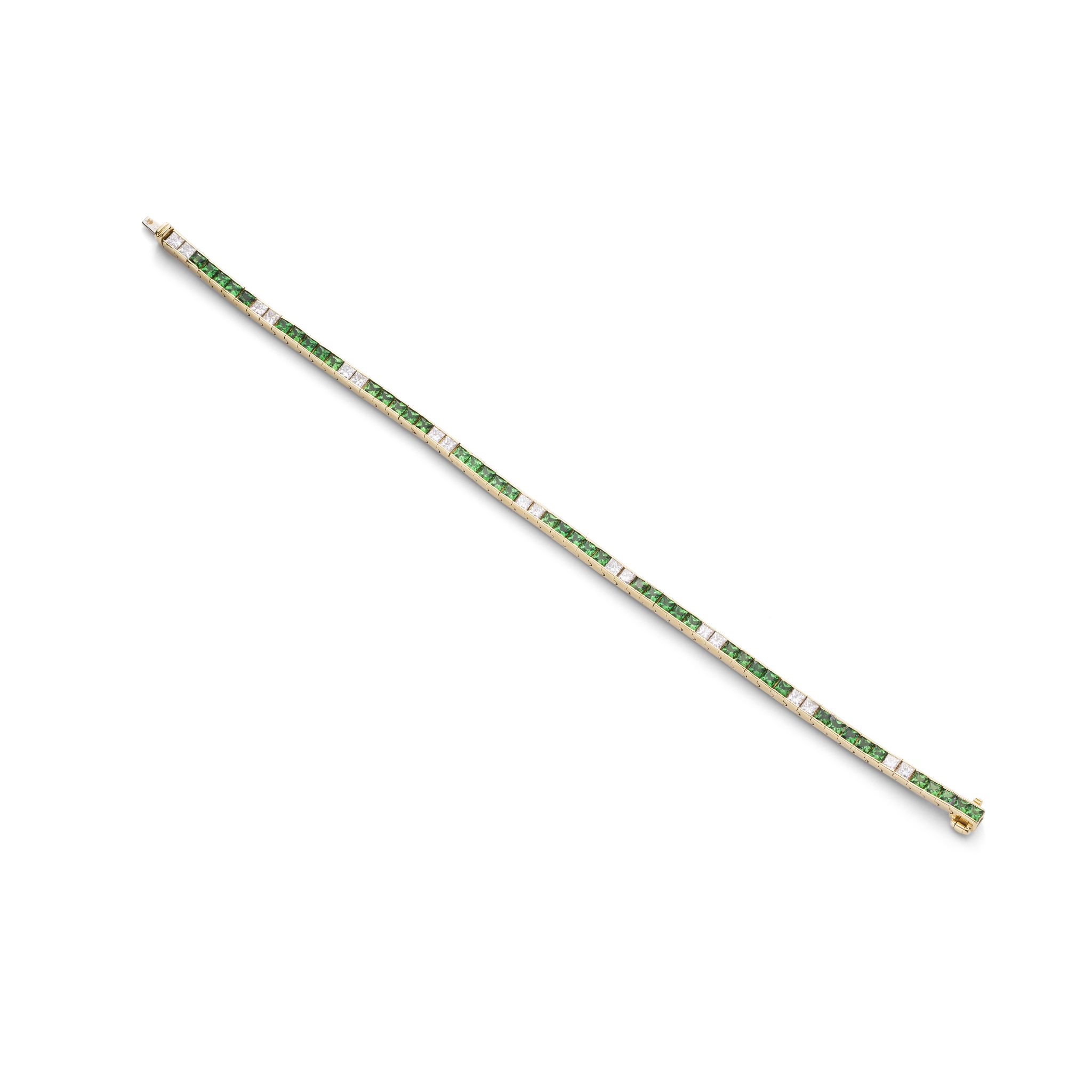 Channel-set with alternating princess-cut diamond two-stone and tsavorite garnet five-stone sections