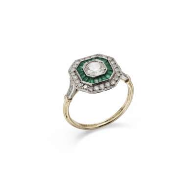 The brilliant-cut diamond centre millegrain-set within an octagonal two tier surround of calibré-cut emeralds and brilliant-cut diamonds, between tapered similarly-cut diamond shoulders, to a reeded hoop