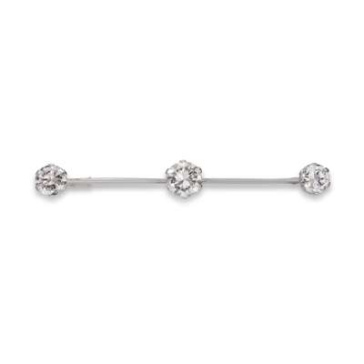 Designed as three graduated old brilliant-cut diamonds in six-claw settings, mounted on a knife-edge bar