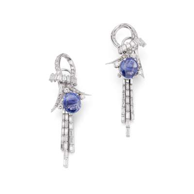 Each centrally-set with an oval-cut sapphire, weighing 3.00 and 3.29 carats respectively, suspending a triple line drop set with baguette-cut diamonds, to a looped scroll surmount set with baguette and brilliant-cut diamonds, post and clip fittings, French import marks