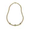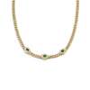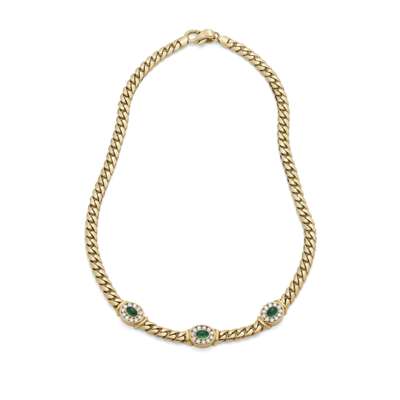 The curb-link chain, set to the front with three oval links, each centrally-set with an oval cabochon emerald, within a channel-set brilliant-cut diamond surround