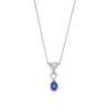 The oval-cut sapphire, suspended from a triangular-cut diamond surmount, each within a brilliant-cut diamond line surround and openwork connector, mounted in 18ct white gold, to a fine trace-link chain, pendant with UK hallmark
