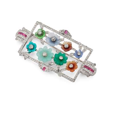 The rectangular rose-cut diamond frame containing carved hardstone flowerheads with collet-set old brilliant and single-cut diamond centres and leaves, between calibré-cut ruby, single and rose-cut diamond pierced quarters, a few rose-cut diamonds deficient, spurious signature