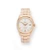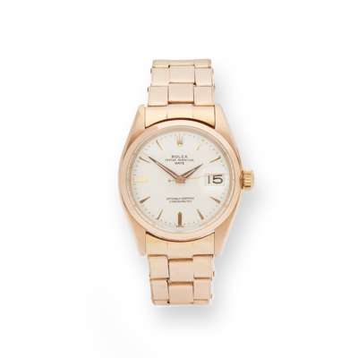 Oyster Perpetual Date model 6534, 1959 from serial number, 18ct rose gold case, automatic movement, round dial with coronet at 12, and applied rose gold wedge hour markers, date aperture at 3, outer seconds track, screw-down crown with coronet, on a rose gold Oyster bracelet strap with 57 to the end links, with signed Rolex 18ct rose gold foldover clasp, no box and papers