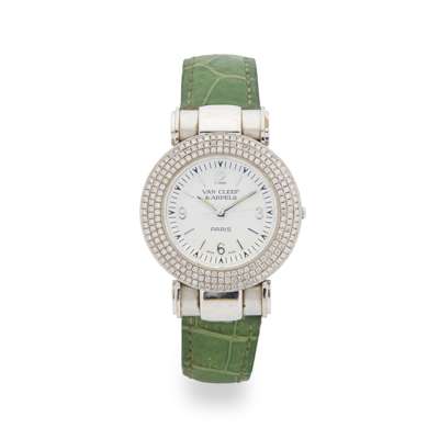 Roma model, c.2000, 18ct white gold case, quartz movement, round white dial with applied silver coloured Arabic numerals and baton hour markers, bevelled outer seconds track in black to the dial edge, lume-filled silver-coloured pencil hands, broad bezel set with three concentric rings of diamonds, the caseback with personalised engraving dated 2000, on a signed Van Cleef & Arpels green crocodile strap, with signed 18ct white gold clasp, no box and papers