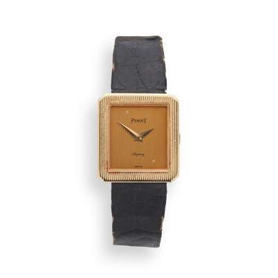 Protocole model, retailed by Asprey, 18ct gold case, manual wind movement, rectangular gold dial with no numerals, bevelled sword hands, ribbed bezel, the caseback with 4154, 302612, on a black Piaget strap with signed Piaget 18ct gold clasp, no box and papers