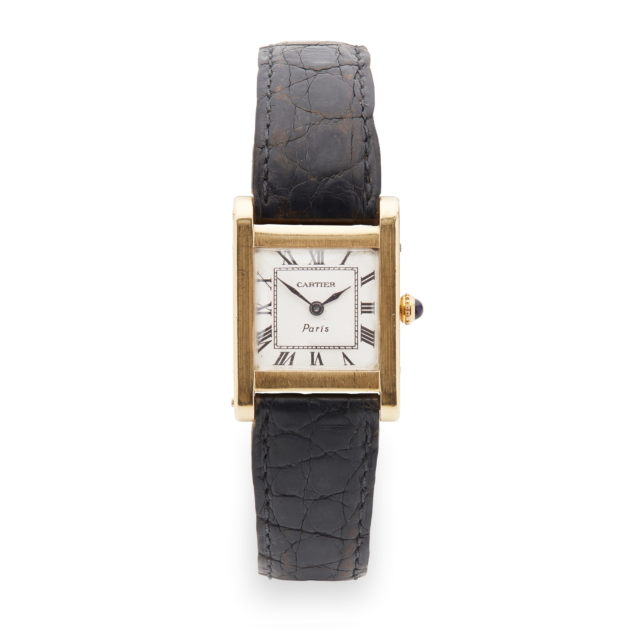Tank model, manual wind movement, square dial with Roman numerals in black, railroad inner seconds track in black, black leaf hands, cabochon set winder, the caseback with 35361, on a signed Cartier black alligator strap, unmarked clasp, no box and papers