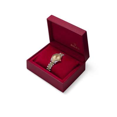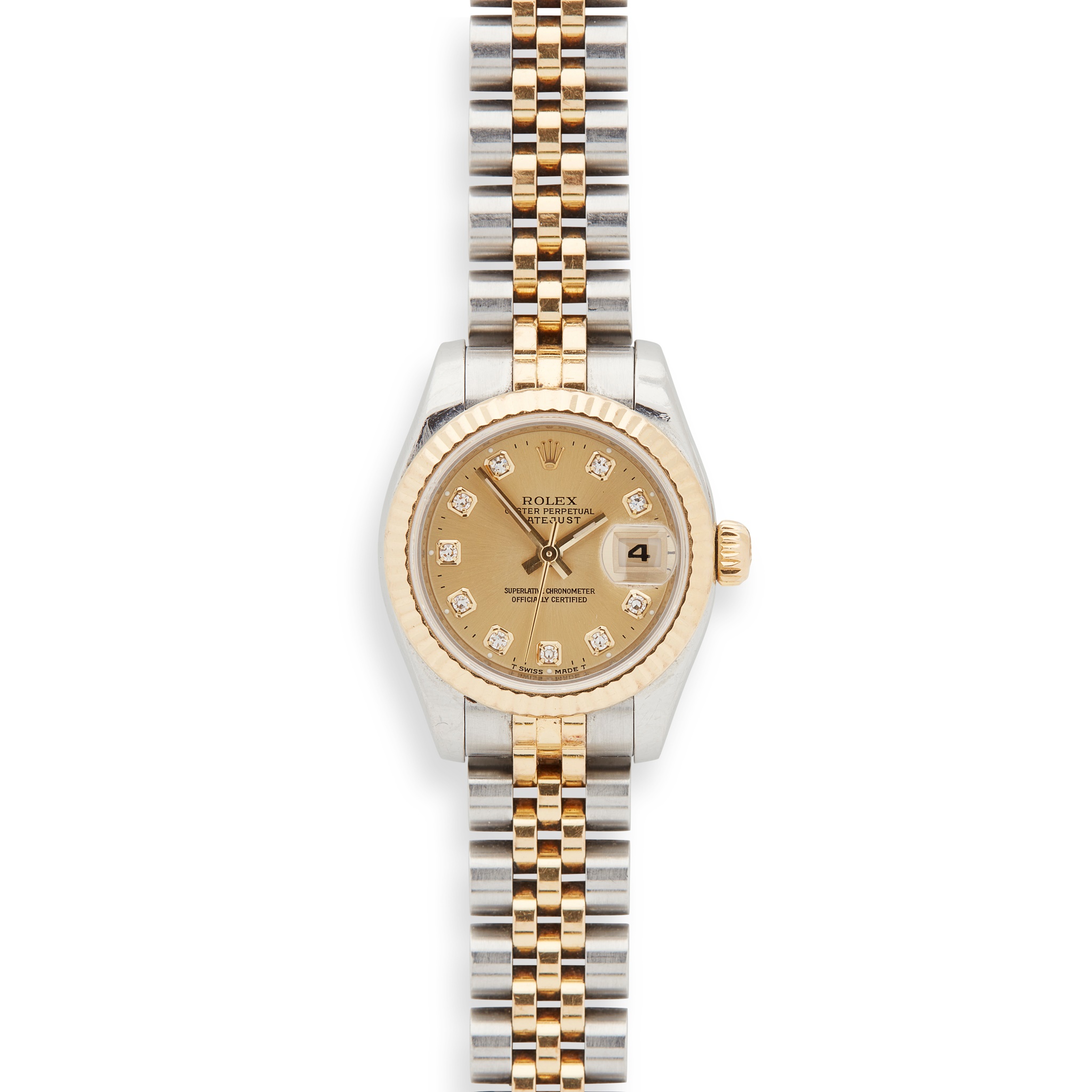 Oyster Perpetual Datejust model 179173, 2008/9 from serial number, stainless steel and gold case, automatic movement, round champagne dial with diamond-set hour markers, date aperture at 3, gold hands, sweep centre seconds hand, gold fluted bezel, screw-down crown with coronet, on a bi-colour stainless steel and gold Jubilee bracelet strap with signed Rolex foldover clasp numbered PJ10, in a Rolex box (not original) with guarantee card, with outer box