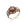 Designed as a flowerhead cluster set with a rose-cut diamond within a flat-cut red foiled gem surround in pinched closed back settings, between diamond three-stone shoulders and a bifurcated hoop with fleur-de-lys detail,