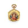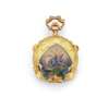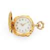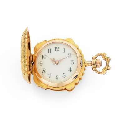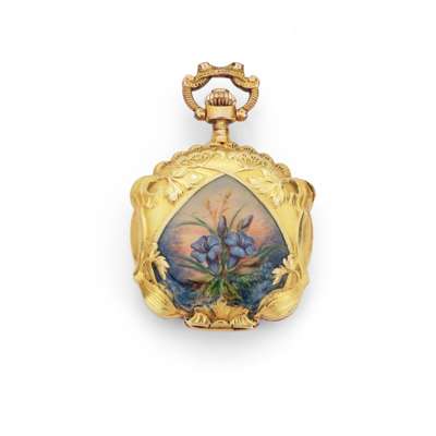 With gold case, full hunter form, keyless wind, unsigned movement, round white enamel dial with Arabic numerals in black, gold dot outer seconds track, ornate pierced gold hands, case front and back moulded with foliate motifs and each with decorated enamel panels, one depicting a woman in classical dress with jewellery, the other featuring blue floral motifs