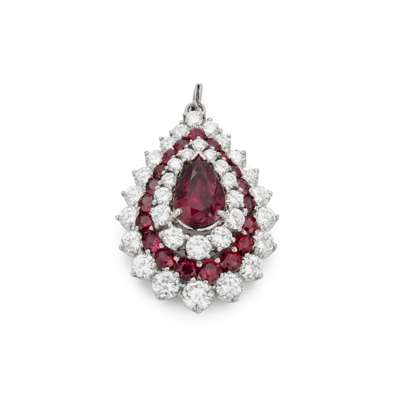 The pear-shaped ruby, within a tiered pear-shaped surround, set with alternating rows of brilliant-cut diamonds and circular-cut rubies, detachable brooch fitting