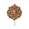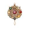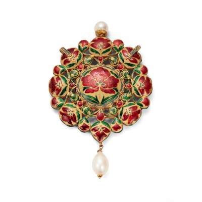 Designed as an octagonal openwork cluster, set with various foiled gems and diamond accents, to a cultured pearl surmount and drop, the reverse decorated with multi-coloured enamel floral motifs