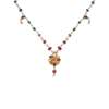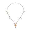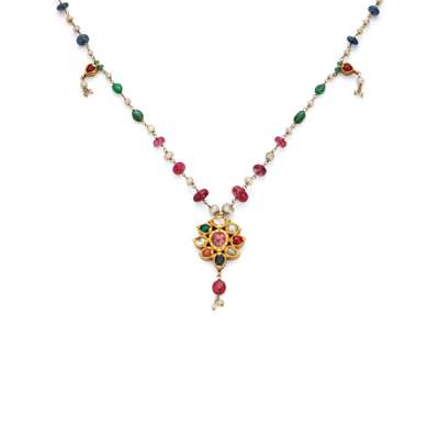 The pendant set with nine cabochon and flat-cut gems in foiled closed back settings, mounted in 18ct gold, suspending a tumbled ruby and seed pearl drop, to a longchain set with alternating seed pearls and ruby, emerald and sapphire beads, suspending four foiled ruby or diamond and seed pearl drops, pendant with UK hallmark
