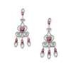 Of chandelier design, each pear-shaped ruby centre within a scrolling openwork surround set with brilliant-cut diamonds, to a marquise-shaped ruby and brilliant-cut diamond triple drop and surmount, post fittings