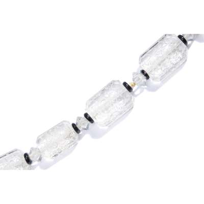 Composed of graduated rectangular clear glass beads engraved with dragonflies and scroll motifs, between black glass rondelles and octahedral glass spacers, a few rondelles deficient