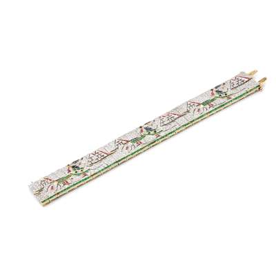 In the Art Deco Egyptian revival style, depicting stylised scenes of the pyramids and the sphinx, pavé-set with brilliant-cut diamonds, and calibré-cut cabochon emeralds, rubies and sapphires, a few stones deficient