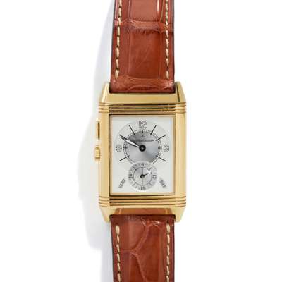 Duoface model 272154, manual wind movement, signed silvered dial with central machined section, Arabic numerals in black, small seconds at 6 also with Arabic numerals, inner seconds track, blued steel sword hands, the case turning over to reveal a second dial with sunken main circular dial to the top, Arabic 12, 3 and 9, with a smaller intersecting subsidiary date dial below flanked by NIGHT and DAY, the dial edge with machined engraving, the case with linear ridges to top and bottom, on both sides, marked 18k 750, on a signed JLC brown strap with signed JLC clasp marked 18K 750 to the interior and with monogram to the exterior