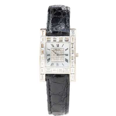 model 13/6402-20, the case with Swiss dog's head assay mark, quartz movement, square mother of pearl dial with a central pave set diamond section, with Roman numerals in black, silver-coloured pencil hands, the bezel and lugs set with baguette cut diamonds totalling very approximately 5.00 carats, with CHOPARD to the case edge, the caseback with 494942 and 427 1, 13/6402-20, on a black strap, unsigned, with a signed Chopard clasp marked 750, set with diamonds, in box, no papers