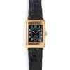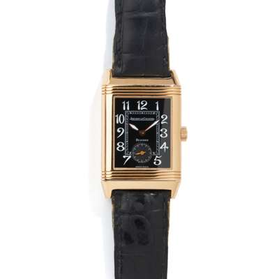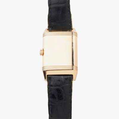 model 270.2.62, originally purchased 2000, manual wind movement, rectangular black dial with Arabic numerals in white, sunken small seconds at 6, railroad inner seconds track also in white, rose gold sword hands with lume inserts, the case revolving to reveal a blank, closed caseback, marked 18K 750, on a signed JLC strap with signed JLC clasp marked 18K 750, in box, with outer box, with Certificat de Garantie
