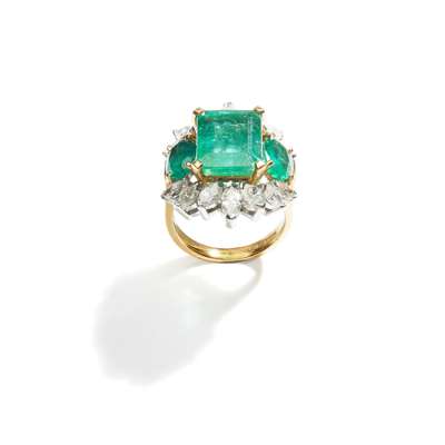 The cut-cornered step-cut emerald between oval-cut emerald shoulders, to a marquise-cut diamond frame, mounted in 18ct gold, maker's mark, UK hallmark