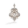 The openwork cartouche of scrolling design, set throughout with rose-cut diamonds and circular cabochon moonstones, mounted in silver and gold