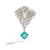 Of shield-shaped design, the central cut-cornered step-cut diamond within a tiered cluster of brilliant and marquise-cut diamonds, suspending a detachable drop set with a cut-cornered square-cut emerald, to a diamond three-stone surmount, pin and necklace fittings