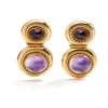 Each oval cabochon amethyst collet-set within a polished 9ct gold surround with ropetwist banding, to a smaller similarly-set surmount, post and clip fittings, signed KMcD, UK hallmark, London 1989