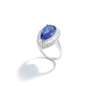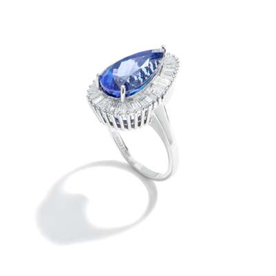 The pear-shaped tanzanite within a tapered baguette-cut diamond surround, mounted in platinum, UK hallmark