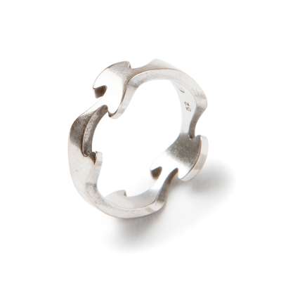 The 18ct white gold band of puzzle piece design, signed, European Convention mark; together with a barrel-shaped pendant of triple puzzle piece design, suspended from a cable-link chain, maker's mark, chain signed