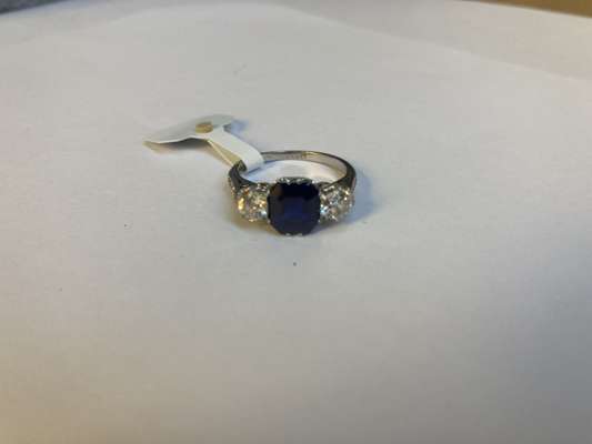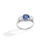 The cut-cornered rectangular-cut sapphire between old brilliant-cut diamonds, to millegrain-set single-cut diamond shoulders