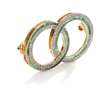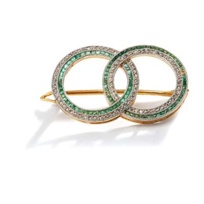 Designed as two interlocked circlets, each set with lines of calibré-cut emeralds and rose-cut diamonds, one emerald deficient, Dutch assay mark