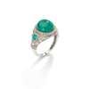 The circular cabochon emerald collet-set within a pierced mount set with old single and rose-cut diamonds, between square-cut emerald shoulders, hoop split