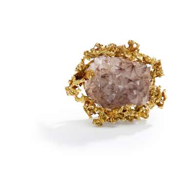 The large amethyst crystal geode within an 18ct gold frame of abstract design, signed B&B, UK hallmark