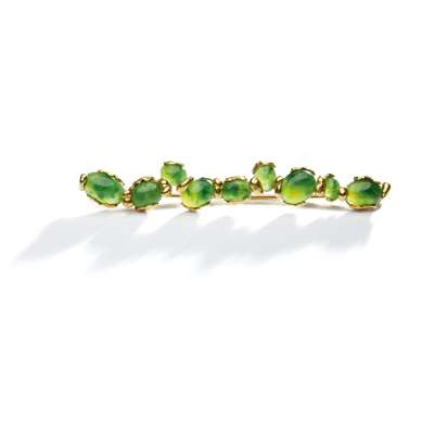 Composed of a series of obliquely-set oval cabochon nephrite jade, within 18ct gold mounts of abstract design, maker's mark, London hallmark