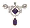 Of swag design, the square-cut amethyst swing centre, within a diamond-set wreath surround, suspending a pear-shaped amethyst drop