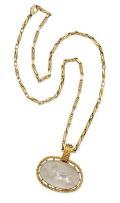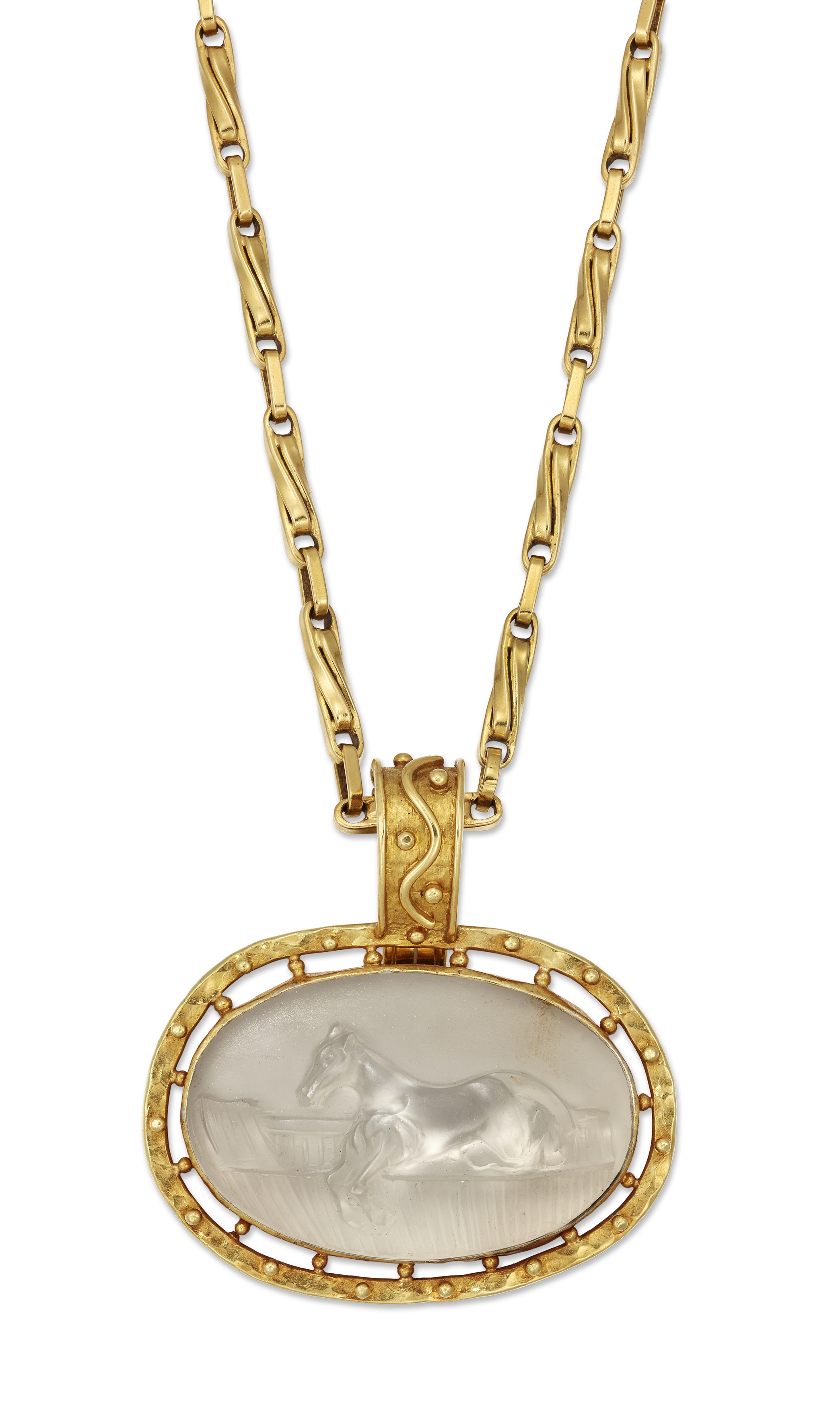 The oval frosted rock crystal plaque carved with a leaping horse, within an openwork frame with bead accents, suspended from an associated fancy-link chain