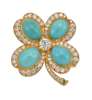 Designed as a four-leaf clover, the central old brilliant-cut diamond within a surround set with four oval cabochon turquoise, to pavé-set brilliant-cut diamond borders and stem, with a green stone accent