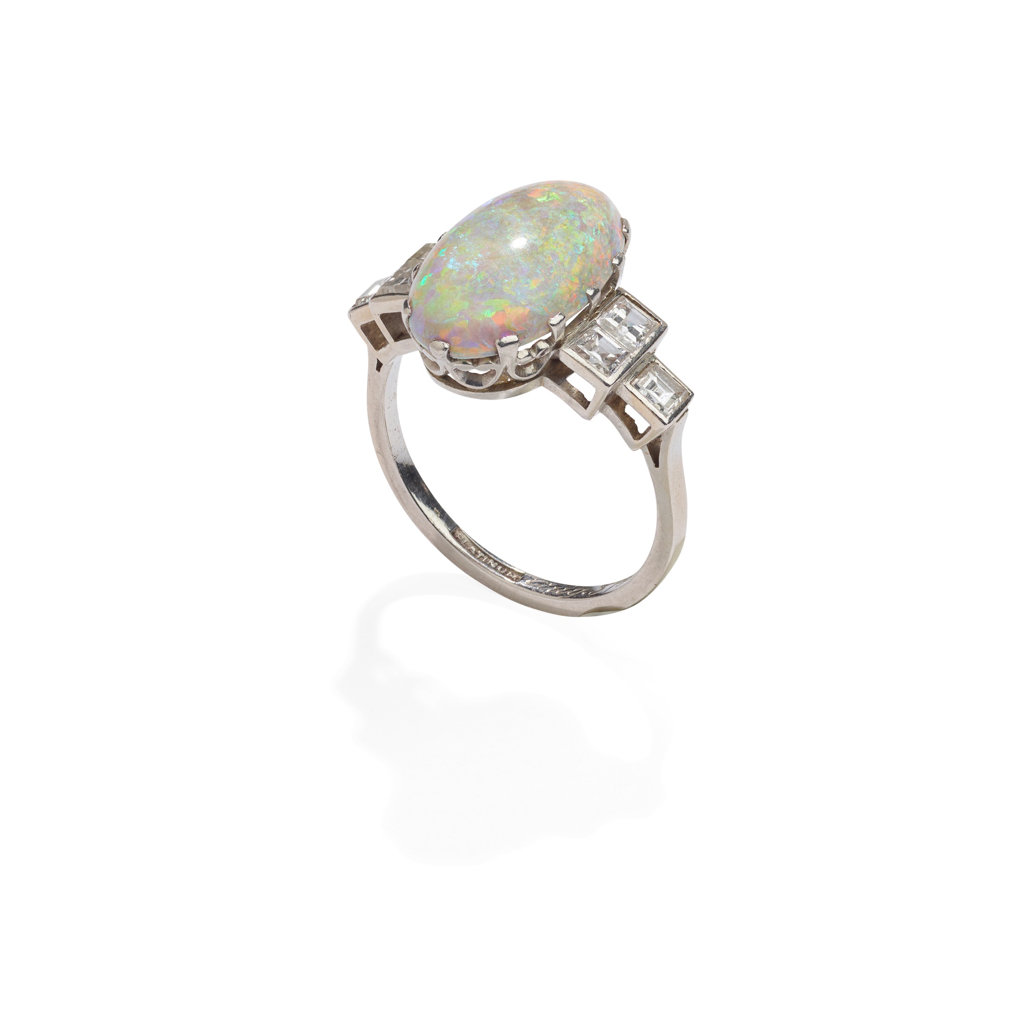 The oval cabochon opal, between square-cut diamond three-stone shoulders, later engraved band