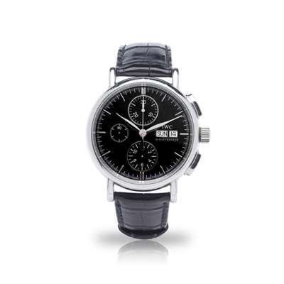 Portofino Automatic model 3565, stainless steel case, automatic movement, 2011 from guarantee card, round black dial with stainless steel baton hour markers, subsidiary dials at 12, 6 and 9 for 30 minute register, 12 hour register and small seconds respectively, day and date apertures at 3, leaf style hands, centre chronograph seconds hand, signed crown, with serial number to the caseback edge, on a signed IWC black strap with signed IWC deployant clasp, in box, with booklets and guarantee card