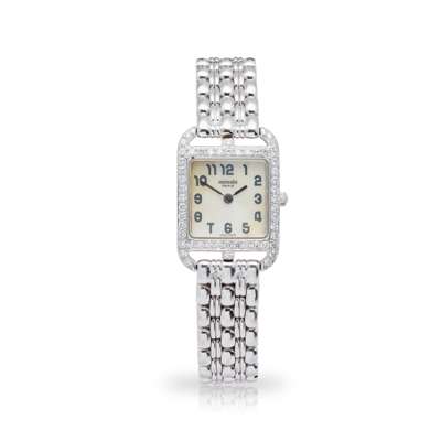 Cape Cod model CC1.192, case marked 750, quartz movement, signed rounded square mother of pearl dial with Arabic numerals in black, black hands, diamond-set bezel and lugs, the caseback with model and serial numbers, on a bracelet strap formed by domed and ribbed links, signed concealed clasp marked 750, with H logo to the exterior, no box and papers
