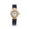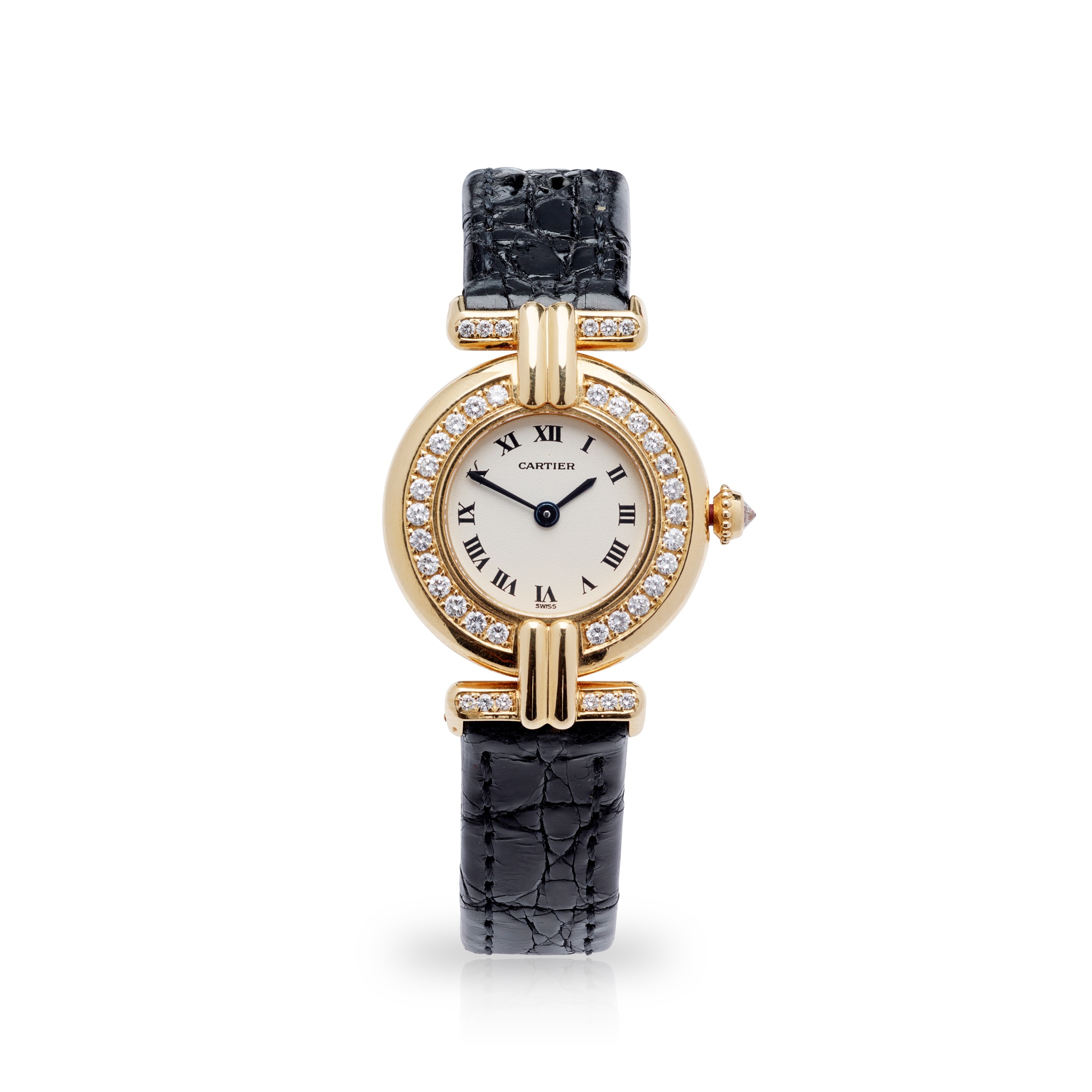 Colisee model, case marked 18K, quartz movement, round buff dial with Roman numerals in black, diamond set bezel, diamond-set crown, the caseback with 1980, CC51602, on a Cartier signed black strap with signed foldover clasp also marked 18K, no box and papers, in travel box