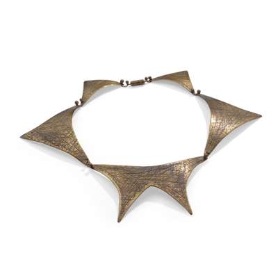 Each composed of a series of shaped triangular panels of textured finish, one interspersed with circular cabochon tourmaline connectors, signed CdeTemple Handmade design
