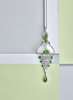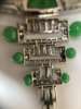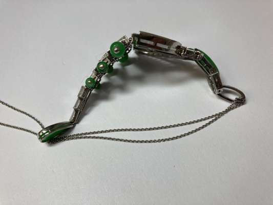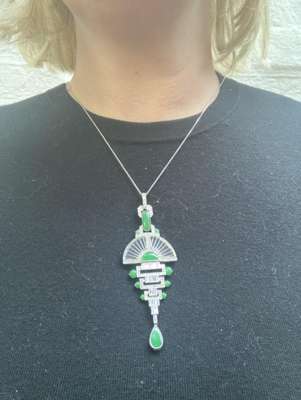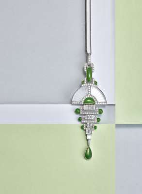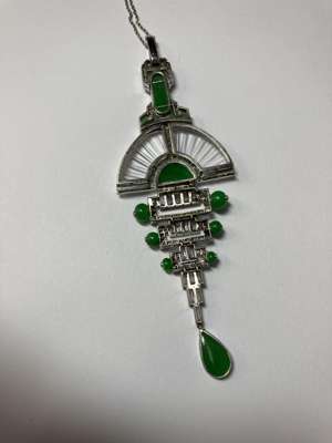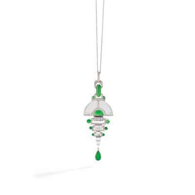 Of geometric openwork design, the centre composed of two carved rock crystal panels, framing a half-moon-shaped cabochon jadeite, with old brilliant-cut diamond borders, to a tiered baguette and old brilliant-cut diamond drop with jadeite bead finials, suspending a pear-shaped jadeite pendant, to a similarly-set surmount, suspended from a fine trace-link chain