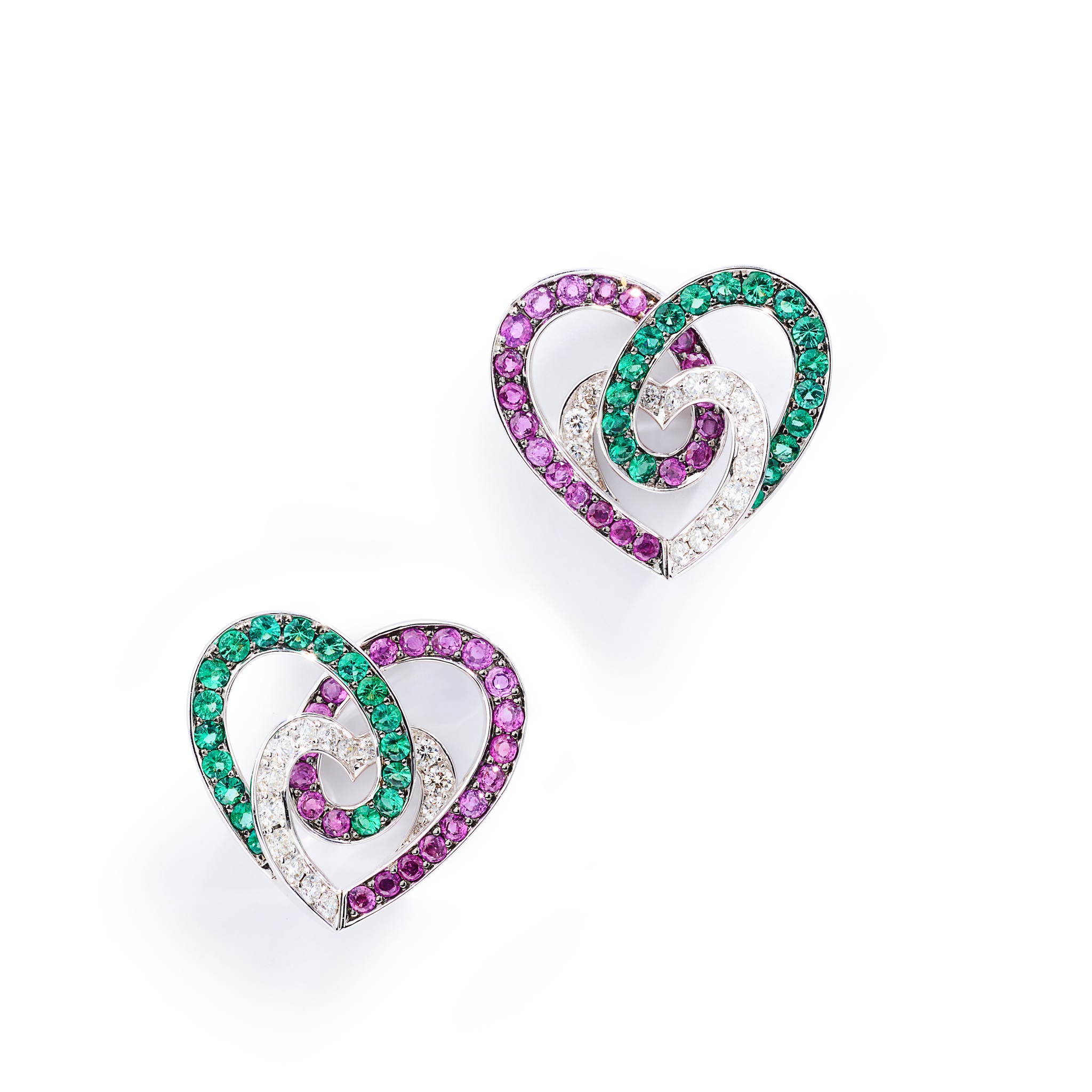Each designed as an openwork heart within a heart, set with circular-cut rubies and emeralds and brilliant-cut diamonds